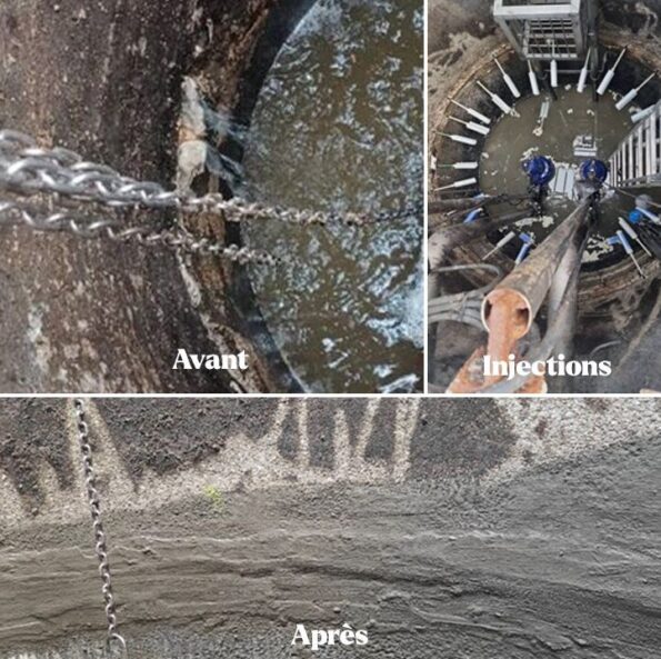 ✅ carottage pour injection d’une résine polyuréthane spécifique à l’extérieur de l’ouvrage, depuis l’intérieur. 30 injections auront été nécessaires sur toute la circonférence de l’ouvrage pour l’étancher complètement