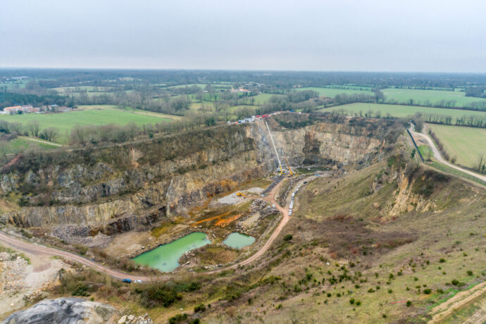 Il y a tout juste un an, en février 2022, une étape emblématique du chantier a eu lieu : les dernières canalisations de la Carrière des Clouzeaux ont été posées à l'aide de deux grues sur la paroi verticale de la falaise haute de 60 mètres !